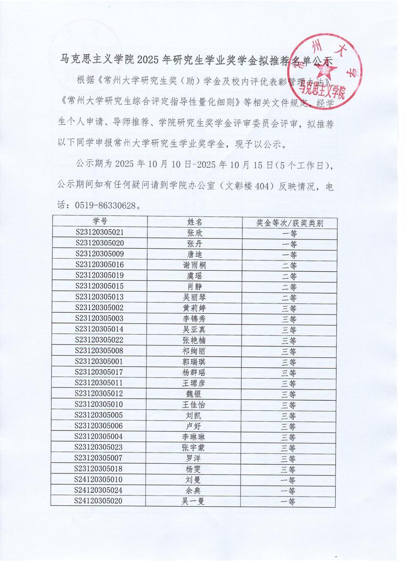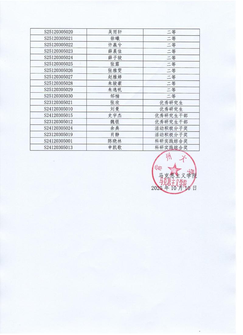 马克思主义学院2025年研究生学业奖学金拟推荐名单公示