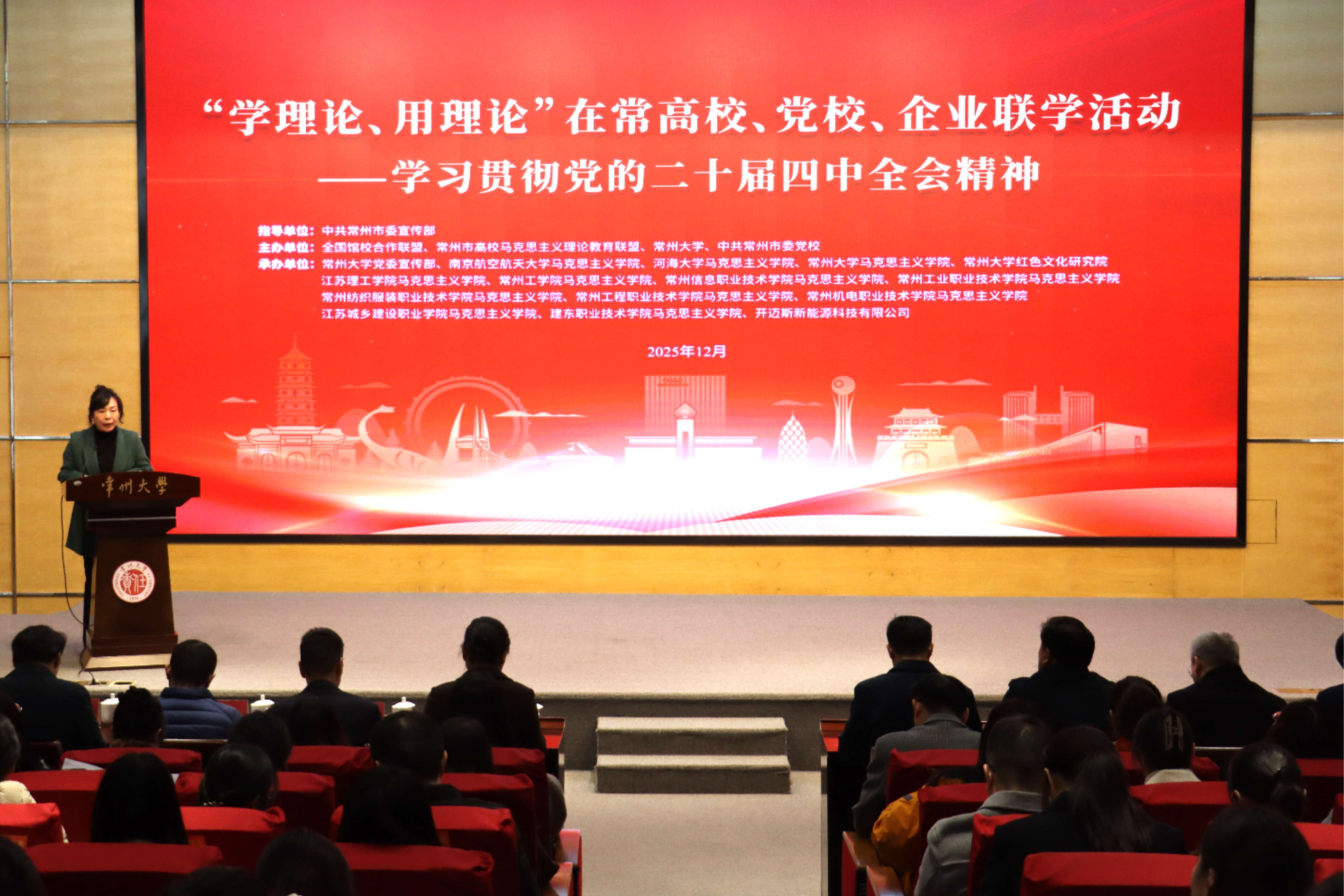 2025年12月11日上午,由常州市委宣传部指导,全国馆校合作联盟、常州市高校马克思主义理论教育联盟、常州大学、常州市委党校联合主办,常州大学党委宣传部、在常高校马克思主义学院、开迈斯新能源科技有限公司等多家单位共同承办的在常高校、党校、企业联学党的二十届四中全会精神活动在常州大学成功举办。常州市委宣传部常务副部长汪忠泽、常州大学党委副书记黄海燕、常州市委党校常务副校长陈海军等领导出席活动,来自在常高校马克思主义学院院长及骨干教师代表、市委党校及各区(县)党校领导和骨干教师代表、市宣讲团成员代表、常州大学马克思主义学院师生代表等200余人齐聚一堂,共学全会精神,共话协同发展。