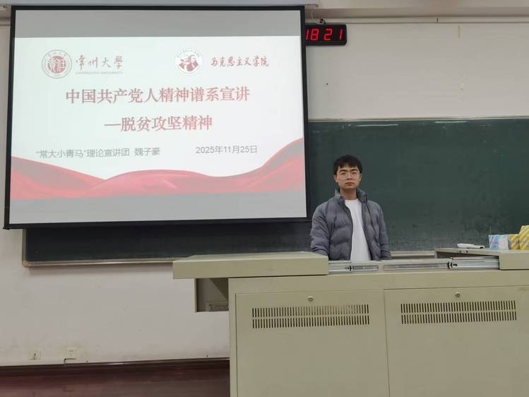 11月25日,“常大小青马”理论宣讲团在常州大学科教城校区主楼W1206开展主题宣讲活动,2025级研究生魏子豪担任本次宣讲人,药学院部分2025级本科新生参加。