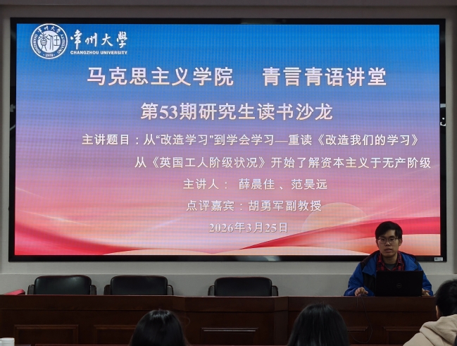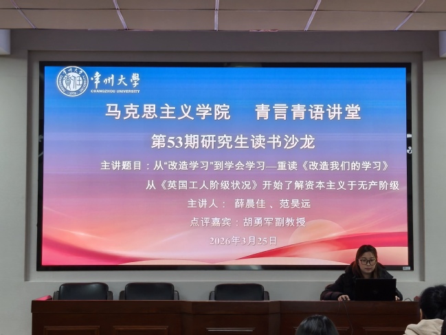 3月25日上午,学院在文彰楼四楼秋白讲堂举办第五十三期研究生读书沙龙活动。本次读书沙龙活动由2025级研究生薛晨佳和范昊远作读书汇报,胡勇军老师出席并担任点评嘉宾,2025级全体研究生参加。