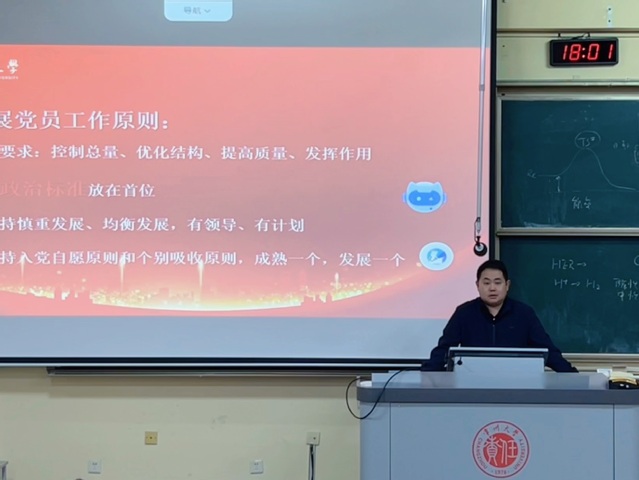 3月31日晚,材料科学与工程学院党委书记储志新以《中国共产党的性质》为题,从党的宗旨、党的性质、党的群众路线三个方面详细解读中国共产党的性质及其重要意义。他希望学员们深入地了解党的性质,增强对党的认同感和归属感,积极投身到新时代中国特色社会主义的伟大实践中去。