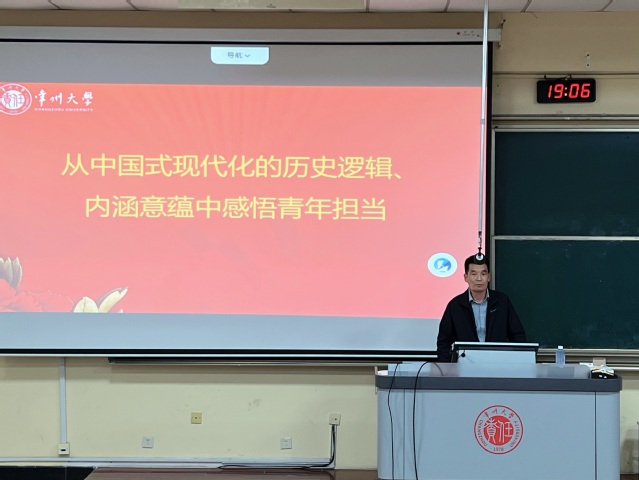 4月9日晚,校团委书记仲杉以《从中国式现代化的历史逻辑、内涵意蕴中感悟青年担当》为题,从历史、内涵及意义三个方面阐述了什么是中国式现代化。他鼓励学员们勇于扛起中国式现代化道路的青年担当,在中国式现代化历史进程中贡献智慧和力量。